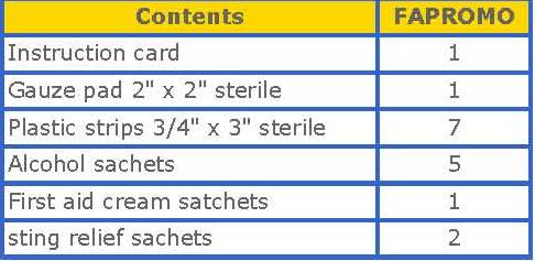 This Promo First Aid Kit has the basics in case of emergency.Comes in a hard plastic curved case. To view contents click on the Photos tab above.