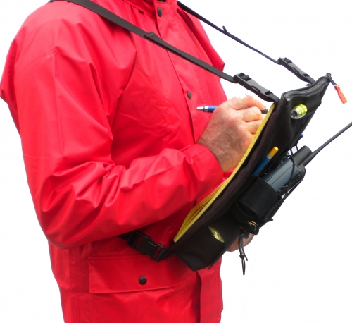 The Deluxe Radio Harness is the only radio harness that allows you to carry a full letter size notepad. The 11"x 14" body has a full size top loading zippered closure pocket and a velcro closure side loading pocket. The 1"nylon webbing shoulder harness is adjustable so the harness can be used as a writing surface for note taking.(See Photo).The front of the harness has two adjustable radio holders that will accomodate any size radios allowing full access to the controls.Other features include a Pen,Pencil holder, a Mini Flashlight holder, D-Rings, Spare Battery Pocket and a Zippered Pocket for a Cell Phone, GPS or other Instruments.Made of 1000 denier cordura nylon Size: 11" x 14"