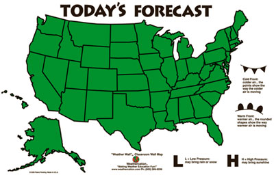This king sized national map can't be missed, even in a large classroom. The giant, easy to hang poster includes 19 colorful, movable and meteorologically accurate weather symbols; a great way to spark interest in weather science. Includes: 28" x 44" United States weather map, one sheet of imprinted static cling weather symbols. Grades K-12