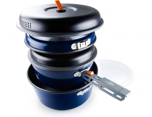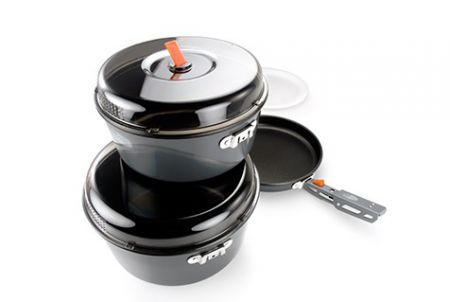 Premium performance at an exceptional value is found in the GSI Outdoors Bugaboo Base Camper-Medium cookset. Bugaboo is the dependable, non-stick option for all your outdoor cooking needs. These high-quality aluminum pots and pans are light enough for backpacking, yet heat evenly enough to satisfy the most demanding camp cook. Plus, each piece is fully formed then coated with two layers of durable nonstick coating for added scratch resistance.