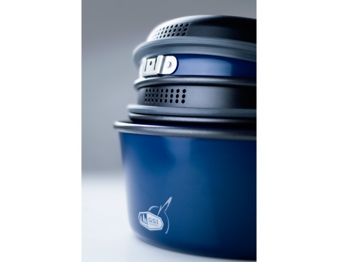 Set includes: 3 L pot, 2 L pot, 8" frypan, two strainer lids, cutting board, folding pot gripper, stuff sack.