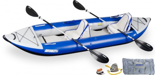 The Explorer Kayak can be piloted by one and easily accommodates two adventurers and their gear. With a beam of just over three feet wide, you get extreme stability. Two shock-absorbing inflatable seats (or optional Tall Back seats) are held rock-solid with nylon webbing that clips to six integrated D-rings. The Explorer Kayak comes complete and ready for action.