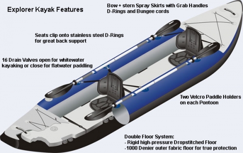 Computer-aided design and state-of-the-art fabrication allows a reduction in weight (9-12lbs) while improving structural strength. Now with 16 drain valves for super-fast self-bailing in white water. Also features, removable slide skeg for improved tracking on open water. These new Explorers are the "pound for pound" champions capable of handling any type of adventure.