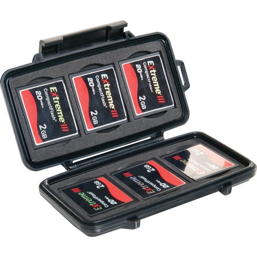 Pelican's 0945 Memory Card Case protects up to 6 of your Compact Flash cards at once! Made the Pelican way - which is to say tougher than tough - this Memory Card Case snugly holds the cards in the removable, shock absorbing liner. Additionally, the water resistant seal (IPx4) ensures that your cards will be safe from moisture, even if the case is submerged in water.