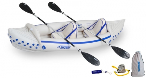 The 330 Pro Kayak Package features two movable, super comfortable Deluxe Kayak Seats for improved back support and 5" high seating and 2 paddles, a foot pump & a carry bag.