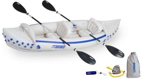 A great package for two! Includes our SE330 Sport Kayak, (2) AB30 paddles, (2) inflatable movable & removable SEC seats, foot pump and carry bag with convenient shoulder strap.
