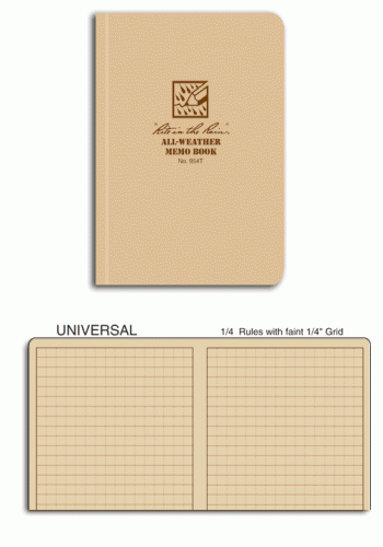 The "Rite in the Rain" Memo Books are bound with a Field-Flex cover. Small and fl exible, they are perfect for keeping in your pocket. No. 964 and 964T have 120 Universal pages (60 sheets). The No. 954 and 954T have 112 pages (56 sheets). Both are available in green or tan. Useful reference material on the inside covers.