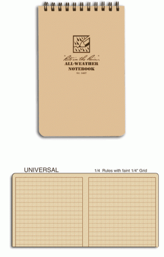 Don’t flag your position with a standard white paper notebook. Instead, protect yourself and your notes by using the "Rite in the Rain" Tactical Notebooks. These spiral bound notebooks have 100 Universal pages (50 sheets) in green or tan. With the Universal Pattern you can use this text for notes and scaled drawings.