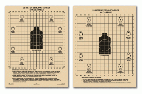 The Zeroing Target is now designed for both the M16A2 / M16A4 and the M4 CARBINE. Printed 2 sides (M16A on the front, M4 on back) on heavy 100# "Rite in the Rain" 8 1/2" x 11" tag. The tough sheets will survive the range! Tan sheets. Sold in packs of 100. (2 lbs / pack