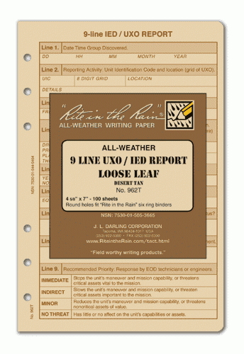 The Tactical Loose Leaf sheets have a round, six-hole punch to fi t the "Rite in the Rain" Field Ring Binders. 100 sheets per pack. Covers and kits are also available. The holes fit the Franklin Covey "Compact" size punch.