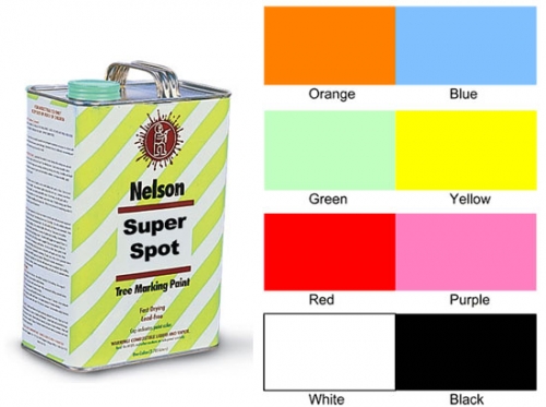 Super-Spot is the most popular and most used paint in the industry and the standard to which all other paints are compared. NELSON SUPER-SPOT is washable with soap and water when wet and you may easily wash your hands or wipe boots off when the paint is still wet. Professionals seeking long term marks, but do not require the superior longevity of NELSON BOUNDARY-MARK, trust and use NELSON SUPERSPOT as their main tool for marking. Conveniently packaged in cone top quarts for direct use with our D-103 or LT-104 Tree Marking Guns or buy the value sized oblong gallon can. Both sizes available in our 8 color selection.